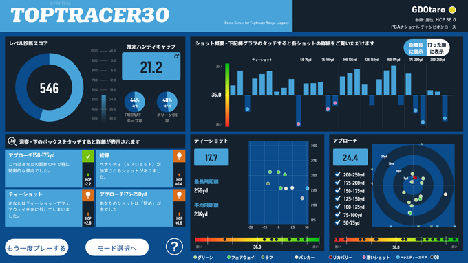 ティーショットに加えてアプローチの距離によってもアドバイスを得ることができ、スマートフォンのアプリでも結果を見返すことができるのは嬉しい点です。