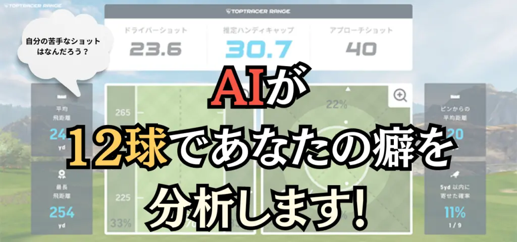 【TOPTRACER12】ではAIがさらに進化!12球でショットの傾向から想定ハンデを分析モードになります気軽に使ってもらえるようになりましたので次回の来場時にお試しください。そんなトップトレーサー12を使った効果的な練習方法を見つけました。