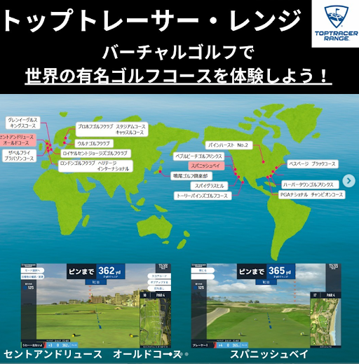 トップトレーサーの技術は、ボールの飛距離、スピン、打ち出し角度などを正確にトラッキングし、リアルなゴルフ体験を提供します。また世界中の有名なゴルフコース(例:セントアンドリュース、ペブルビーチなど)を仮想的に体験でき、実際にそのコースに行くことが難しい場合でもプレイを楽しめます。