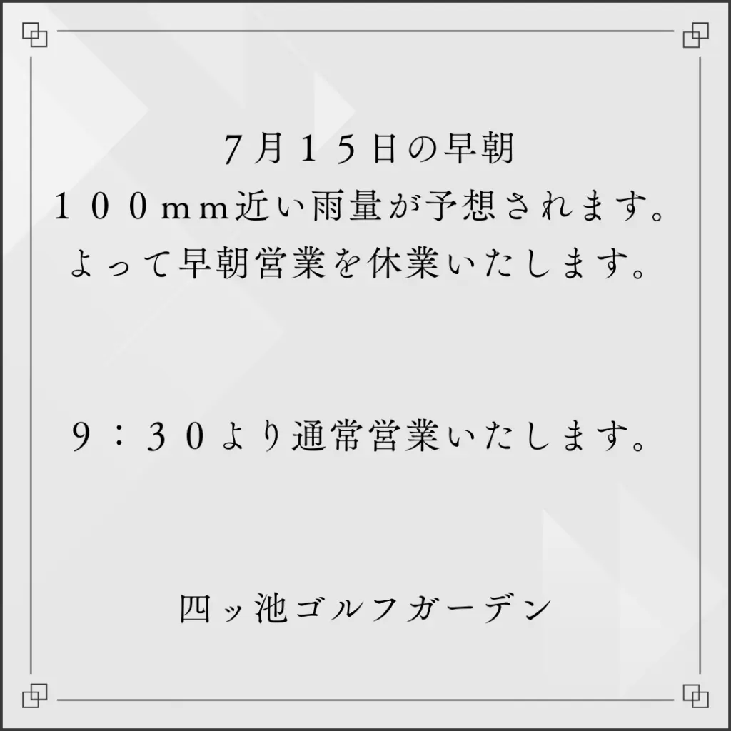 7月15日(火) 大雨による早朝営業休業のお知らせ
